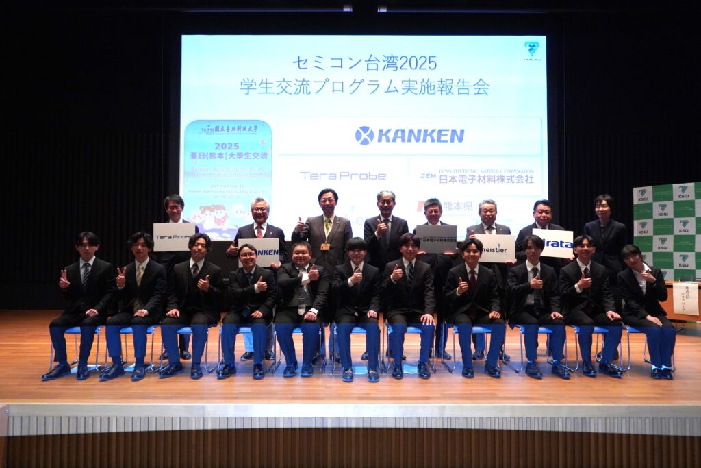 合わせて、総会終了後、KSGIが協賛した学生交流プログラムの報告会が行われました。台湾での研修を終えた学生たちによる報告会が開催され、参加学生に加え、木村知事、山口会長、協賛企業(カンケンテクノ、テラプローブ、日本電位材料、マイスティア)、そして台湾で訪問受入を行った平田機工の皆さまが壇上に上がり、盛大に実施されました。代表学生2名による報告では、今回の研修が非常に充実したカリキュラムであったことが伝わり、参加者からも深い関心が寄せられました。また、学生全員が一人ひとりコメントを述べる場面では、それぞれが明確な考えを持ち、国際的な視野を備えつつある姿に、多くの関係者が感銘を受けました。最後には、木村知事と山口会長から温かい激励の言葉が贈られ、学生たちの今後のさらなる活躍に大きな期待が寄せられる会となりました。